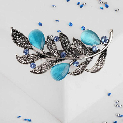 Брошь "Веточка с листочками Кошачий глаз" 65*30мм арт.1354625 голубой