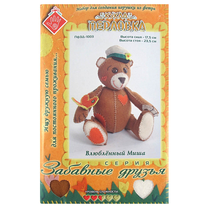 Фетр различных рассцветок, хлопок, нитки для вышивки и декорирования, листы с выкройками персонажа, подробная инструкция для изготовления игрушки.