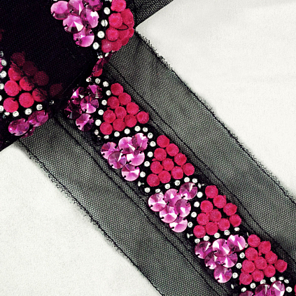 Тесьма с бусинами и стразами 85мм арт.MLS-1017 малиновый/черный